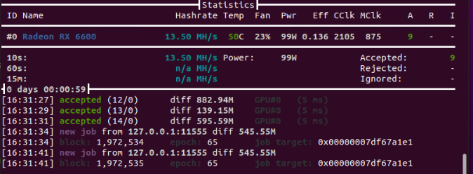 sudo ./wildrig-multi --print-full --algo progpowz --protocol ethproxy -u miner -o 127.0.0.1:11555 -w worker1 -p x